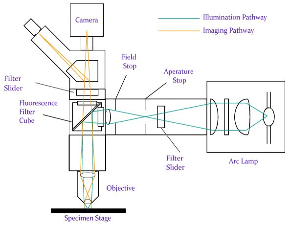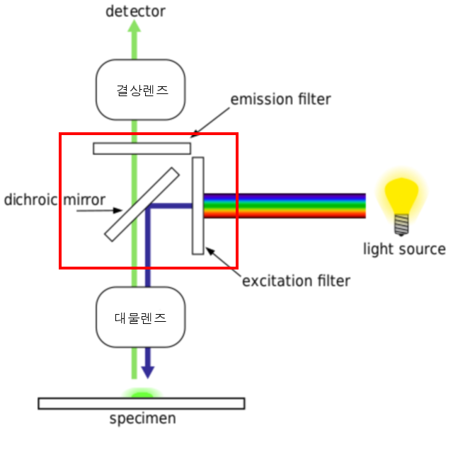 그러나, 반사조명 형광관찰법에서는 여기필터에 의해 여과된 짧은 파장의 여기광이 dichroic mirror를 통해 대물렌즈로 들어간다. 대물렌즈는 스스로 condenser 역할을 하고, 표본으로부터 방출된 형광은 대물렌즈로 되돌아옵니다. 그리고 dichroic mirror를 통과한 후 barrier filter를 거쳐 접안렌즈로 들어가게 됩니다.