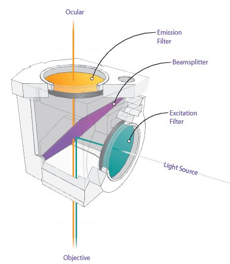 는 광원에서 방출된 빛 중에서 원하는 특정 파장의 빛만 통과시킵니다. 표본의 형광 물질은 여기된 빛을 흡수하여 더 긴 파장대의 빛을 방출합니다. 이때 암시야 콘덴서는 여기광을 대물렌즈 광로에서 벗어나도록 방출시킵니다. Barrier filter는 남은 여기광들이 접안렌즈에 도달하지 못하도록 막아주게 됩니다. 따라서 어두운 배경에서 표본의 선명도와 Contrast가 커지게 만들 수 있습니다.