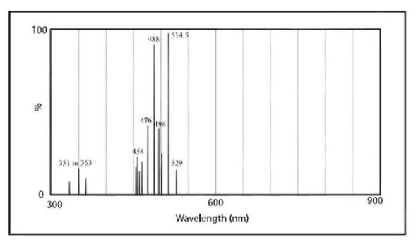 보통은 단색광의 좁은 스펙트럼 대역에서 극히 밝다. 하지만 레이저광의 간섭성으로 인해 샘플 영역에 균일한 조도로 비추기 어렵지만, Confocal 현미경에서는 갈바노 미러를 이용한 스캔 방식을 이용하여 이미지 획득시에 사용되어진다(LSCM). Spectrum of Laser