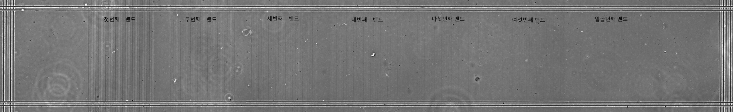 하기의 이미지는 Band 4로 마킹된 HSE/NPL 테스트 슬라이드를 위상차 현미경에 AcquCAM 23S2(camera)를 장착하여 찍은 이미지 입니다. 오른쪽 밴드로 갈수록 선의 선명함이 줄어드는 것을 볼 수 있습니다. (클릭하여 확인 하실 수 있습니다.)