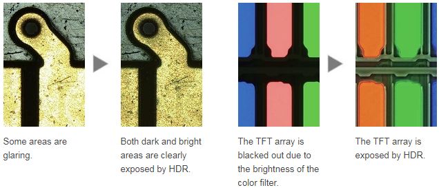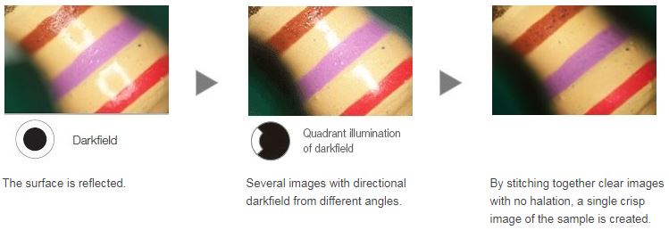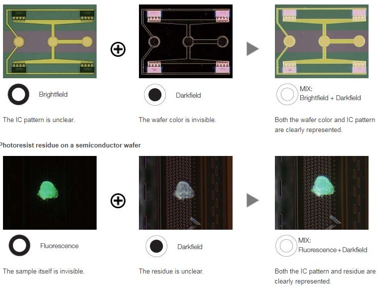 MIX observation technology produces unique observation images by combining darkfield with another observation method, such as brightfield, fluorescence, or polarization. MIX observation enables users to view defects that are difficult to see with conventional microscopes. The circular LED illuminator used for darkfield observation has a directional darkfield function where only one quadrant is illuminated at a given time. This reduces a sample’s halation and is useful for visualizing a sample’s surface texture.