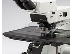The MX63 series delivers contamination-free wafer inspections. All motorized components are housed in a shielded structure, and antistatic processing is applied to the microscope frame, tubes, breath shield, and other parts. The rotation speed of the motorized nosepieces is faster and safer than manual nosepieces, decreasing the time between inspections while keeping the operator’s hands below the wafer, reducing potential contamination.