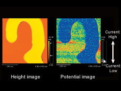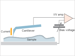 샘플에 바이어스 전압을 인가하여 캔틸레버와 샘플 사이에 흐르는 전류를 감지하여 이미지화시킵니다. 또한 I / V 측정도 가능합니다.