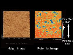 전도성 캔틸레버를 이용하여 교류 전압을 인가하여 캔틸레버와 샘플 표면 사이에 작용하는 정전기의 힘을 감지하고 샘플 표면의 전위를 이미지화 시킵니다. KFM (Kelvin Force Microscope)라고도합니다.