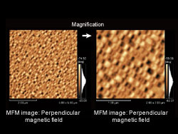 자력을 갖는 캔틸레버를 위상 모드에서 검사하여, 진동 하는 캔틸레버의 위상 지연을 감지하고 샘플 표면의 자기 정보를 이미지화 시킵니다. MFM (Magnetic Force Microscope)라고도 합니다.